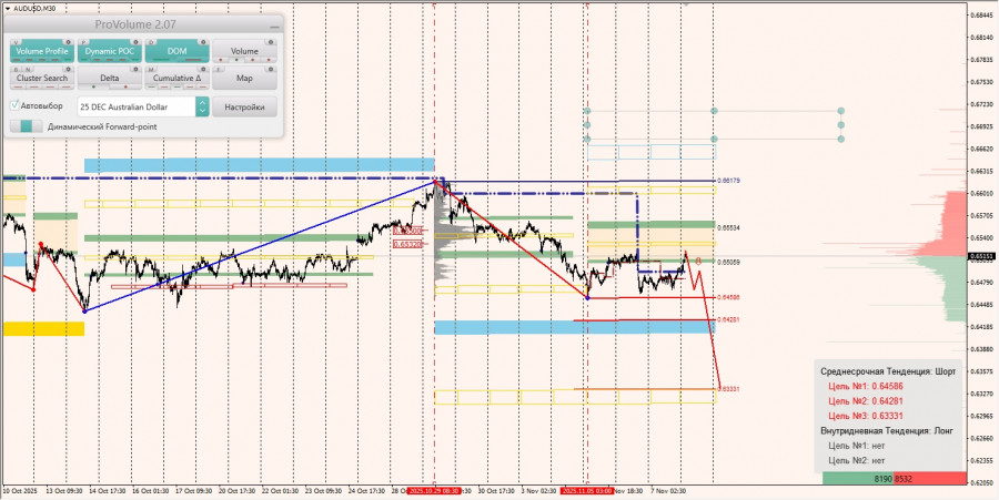 Среднесрочная тенденция: в шорт. Максимальное скопление объемов среднесрочной тенденции расположено в диапазоне по котировкам 0.65320-0.65500. В настоящий момент по паре совершаются инвестиционные операции ниже указанного диапазона, что говорит о силе продавцов.