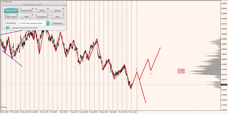 Область выгодных цен на продажу с точки зрения маржинального обеспечения не изменилась и располагается между зонами 1/4 и 1/2, построенными от минимума 05.11.2025.