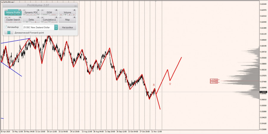 Область выгодных цен на продажу с точки зрения маржинального обеспечения не изменилась и располагается между зонами 1/4 и 1/2, построенными от минимума 05.11.2025.