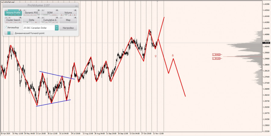 Область выгодных цен на покупку с точки зрения маржинального обеспечения располагается между зонами 1/4 и 1/2, построенными от максимума 14.11.2025.