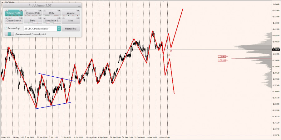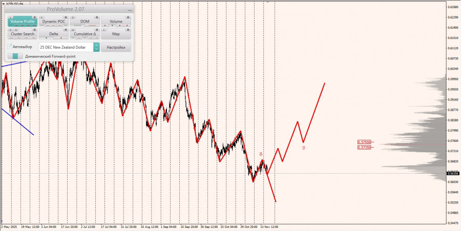 Область выгодных цен на покупку с точки зрения маржинального обеспечения располагается между зонами 1/4 и 1/2, построенными от максимума 14.11.2025.