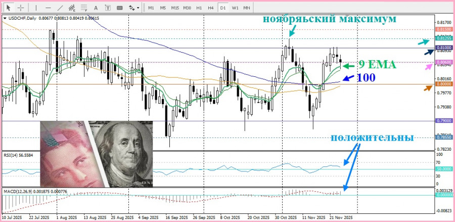 А с технической точки зрения осцилляторы на дневном графике положительны, пара торгуется выше 100-дневной SMA, а так же выше 9 и 14 ЕМА, подтверждая позитивный прогноз. Сопротивление для пары USD/CHF на круглом уровне 0,8100, выше которого цены попытаются бросить вызов ноябрьскому максимуму в районе 0,8125.
