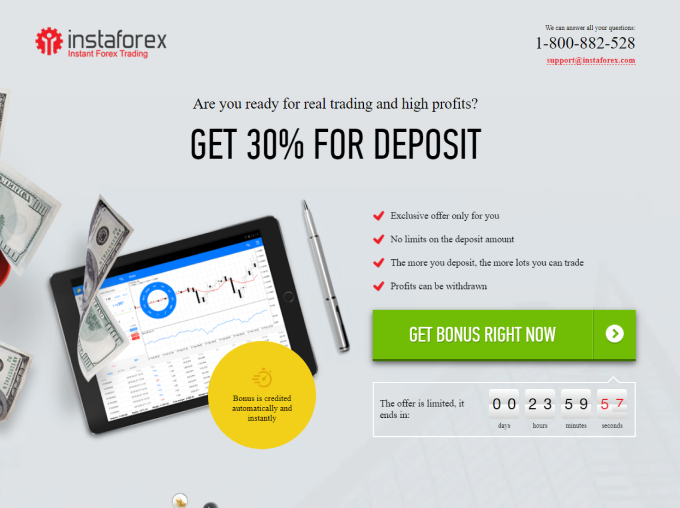 Oferta exclusiva y lucrativa para los clientes de InstaForex. Cuando usted hace un depósito en su cuenta de operaciones, reciba un +30% adicional a su depósito. Los depósitos más grandes hacen posible operar volúmenes más grandes. El bono se concede al instante para cualquier depósito, sin límites.