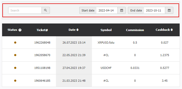 ক্যাশব্যাক প্রোগ্রামটি এভাবে কাজ করে: আপনি সাধারণ মোডে ট্রেড করেন এবং নির্বাচিত ইন্সট্রুমেন্টের জন্য লেনদেন বন্ধ করেন। প্রতিটি ট্রেডিং দিনের শেষে, বন্ধ হওয়া লেনদেনগুলি আপনার ক্লায়েন্ট ক্যাবিনেটে (কেকে) প্রদর্শিত হয়। ক্যাশব্যাক হিসাবে সংযোজনের সাথে সম্পর্কিত সব পরিবর্তন কেকে/ফাইন্যান্সিয়াল অপারেশন/ক্যাশব্যাক ঠিকানায় অনুসরণ করা যায়। এইভাবে, ক্যাশব্যাক বিভাগে দিনের সমস্ত লেনদেন প্রদর্শিত হয়, ইন্সট্রুমেন্ট এবং অর্ডার নম্বর অনুসারে অনুসন্ধান উপলব্ধ, সাথে লেনদেন প্রদর্শনের সময়কাল এবং সংশ্লিষ্ট স্ট্যাটাস নির্বাচন করা যায়।