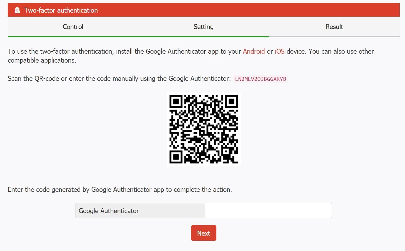 1. To set up two-factor authentication, select the relevant option in the Client Area (tab "Account Settings >> Two-Factor authentication").